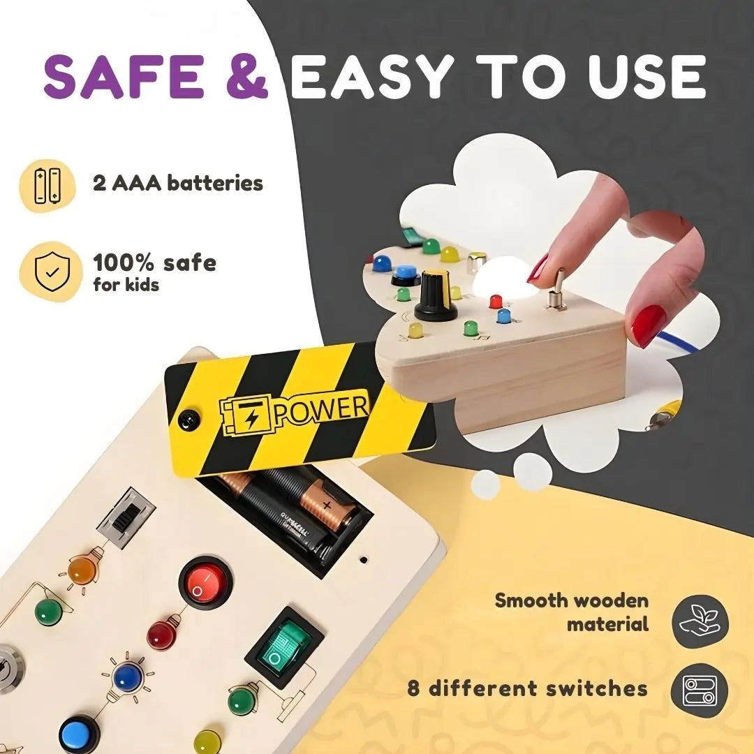 The LED Switch Discovery Board offers a fun, tactile experience with real mechanical switches that provide satisfying resistance and clear results. Featuring eight different switch types—ranging from toggle and rocker to push-button and key switches—each designed to challenge your toddler with various hand movements and problem-solving skills.